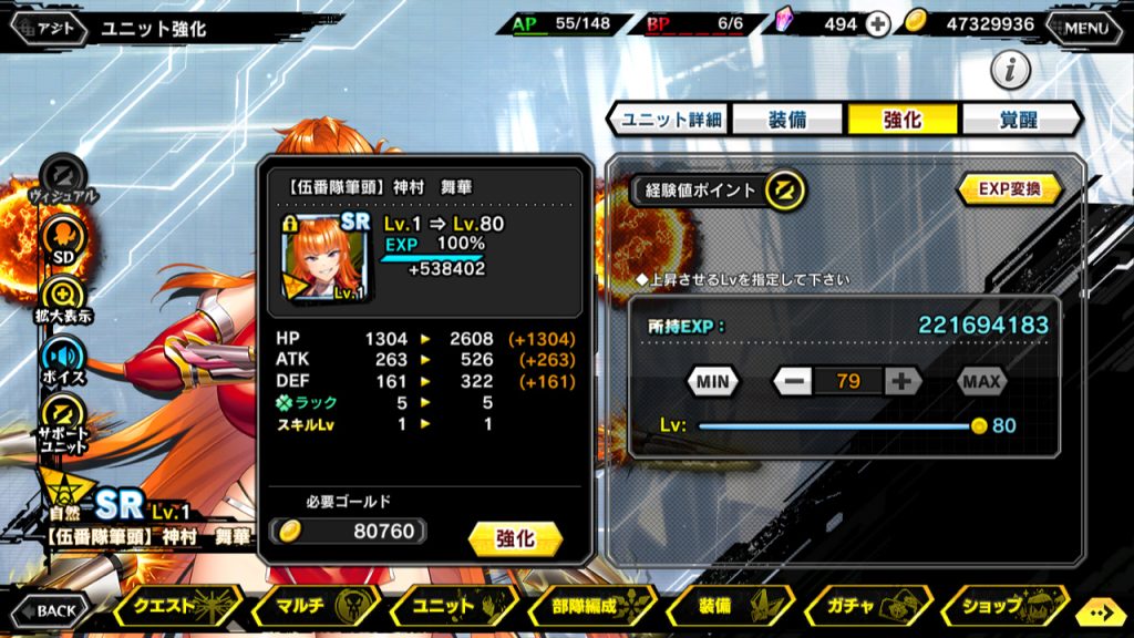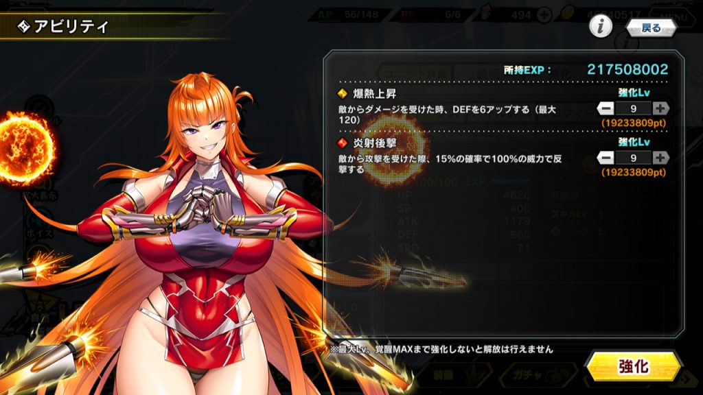 ▲舞華と凜子は、アビリティという新要素を持っている。つまりは常時発動のパッシブスキルだ。解放すると強化Lv1になり、最大9まで成長させられる。解放、LvアップにはEXPが必要で、ふたつともLv9にするには約4000万という莫大なEXPを要求される。その割には……という効果なので、解放は趣味で。凜子なんか下手に解放すると会心率が下がるだけだし