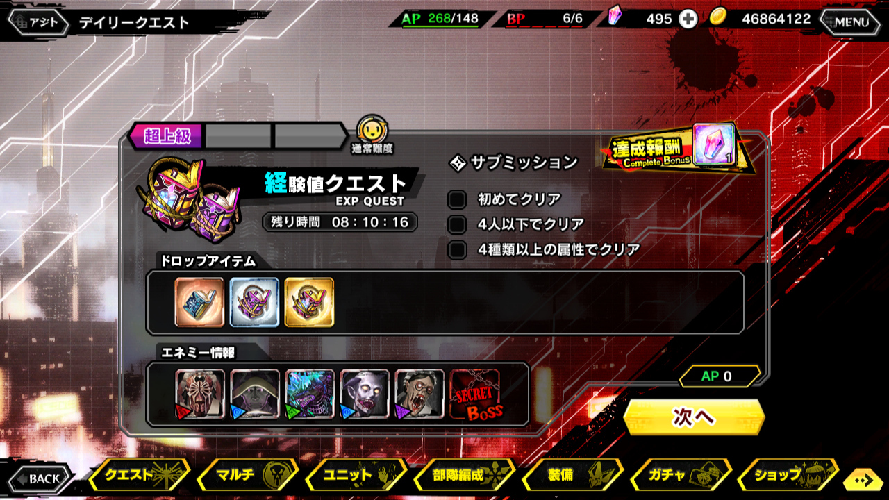 ▲合わせて経験値クエストに超上級が追加された。ボスの冥界の執事が強いので、サブミッションの4人以下クリアを目指す場合、混乱対策を用意して、不利属性の超人は入れないこと