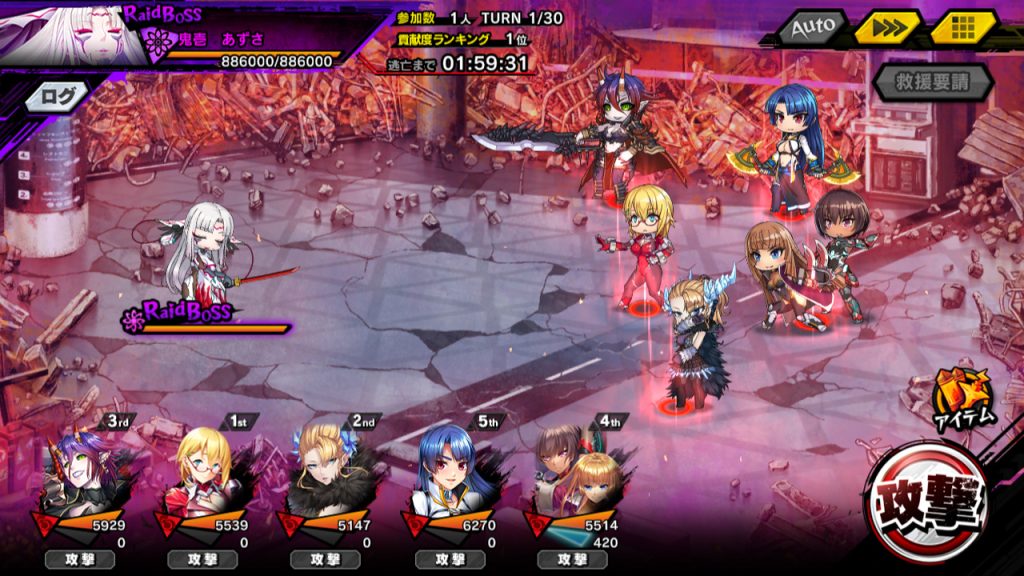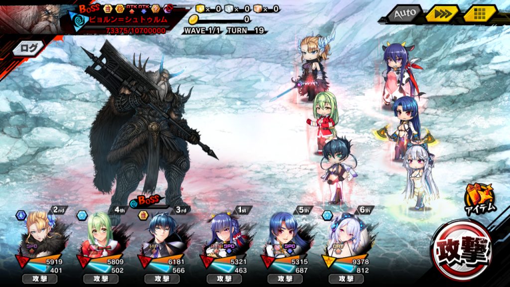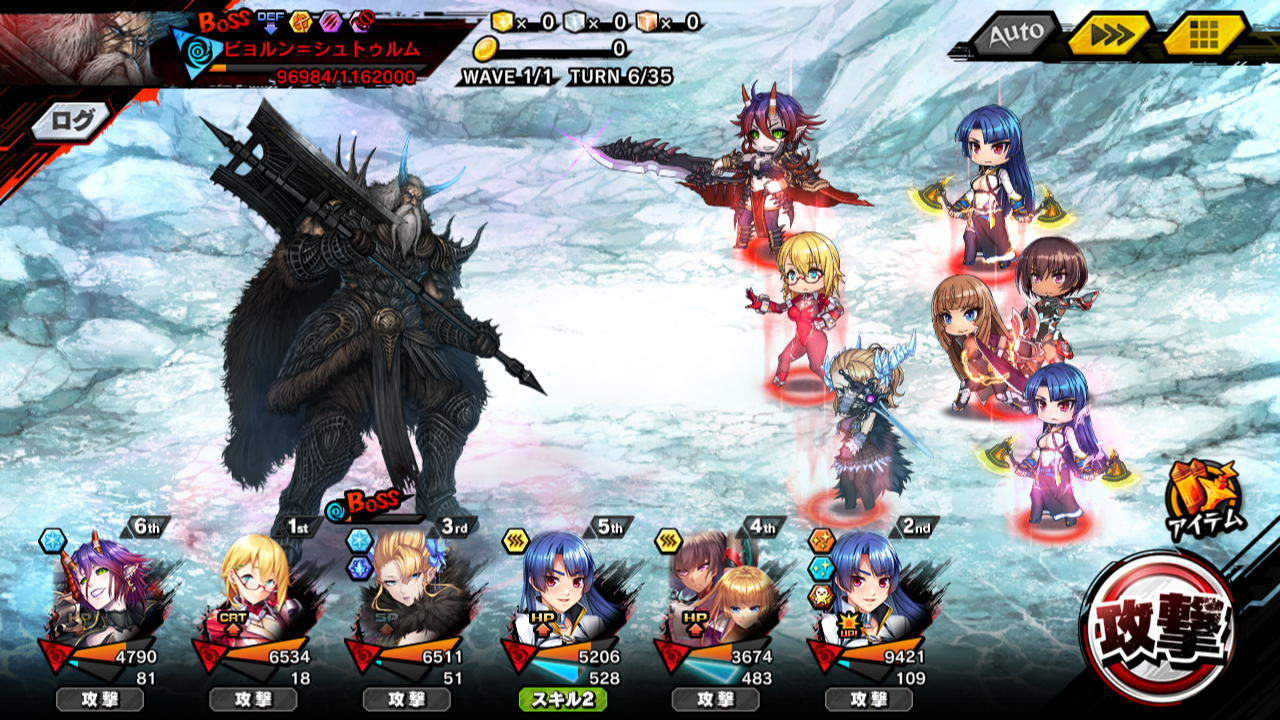 ▲結論は、こう。ラグナロクが会心率&会心ダメージバフ+攻撃、蛇子が被回復効果&与ダメージバフ+攻撃、アサギがATK&DEFバフ+デバフ解除+攻撃、凜子がATKデバフ+ダメージカット+バフ解除、残りがHP&SP回復。麻痺は舞が治すが、その舞が最も麻痺るので、都度アイテムで回復
