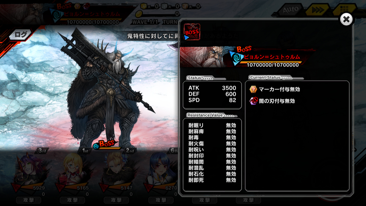 ▲前回、やってなかったチャレンジクエスト~氷角の狂戦士~にも挑戦していく。超上級は余裕として、問題は魔界級。特殊ルールで、こちらの超人属性に魔性特攻とSPDバフをかけてくれる。ただ、ビョルン=シュトゥルムさんは鬼特性に特攻を発揮する。あとマーカー&闇の刃付与無効……闇の刃ってマーカーじゃないんだ