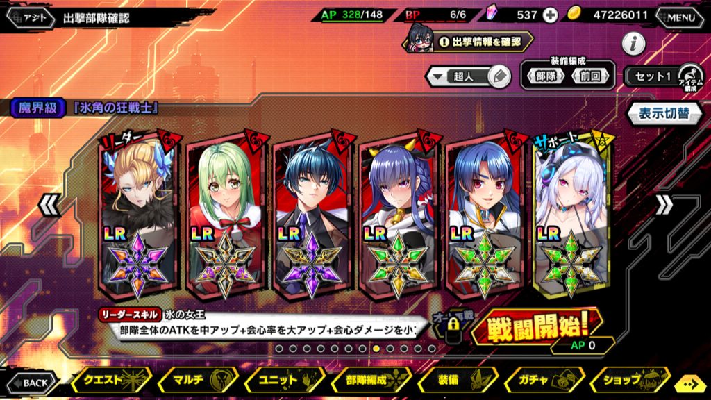 奥義がもうメチャクチャ。要するに、戦闘中1回だけ奥義撃って、あとはスキル2を撃ってれば良さそう。リーダースキルが「戦闘開始時、自身のSPを100%回復+部隊全体の科学属性への与ダメージを特大アップ+敵全体のDEFを中ダウン」なので、リーダーにさえしていれば奥義から入れる。