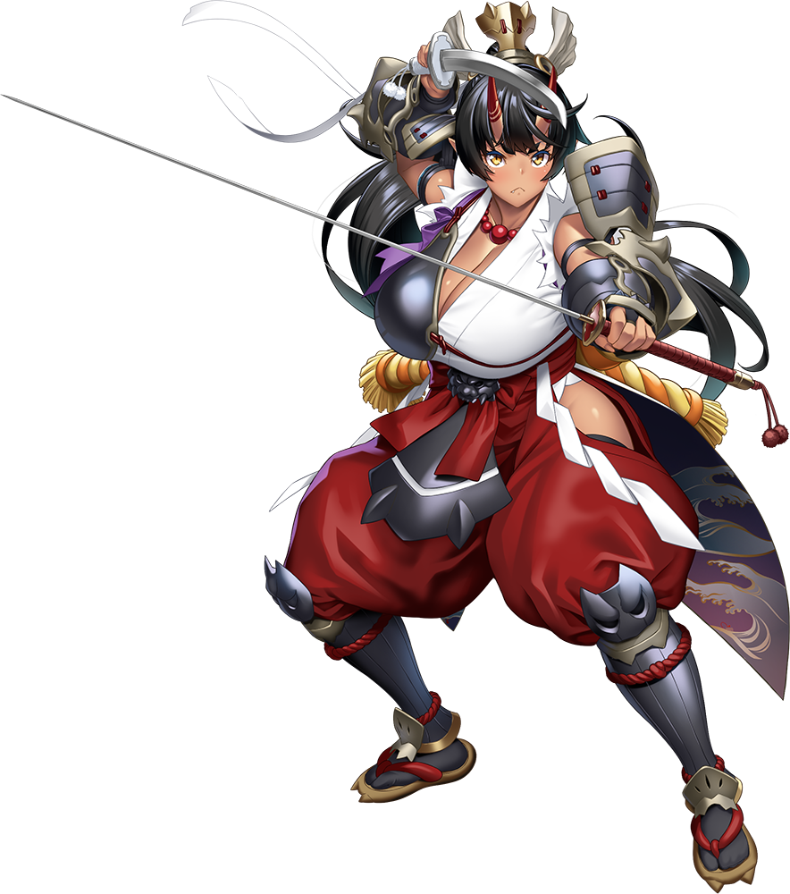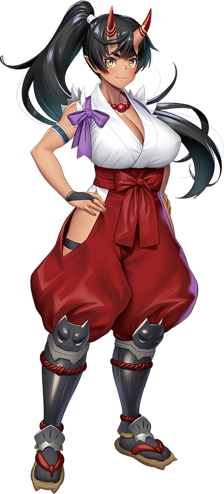 前魔王の副官の一人で種族はオーガ。見た目とは裏腹に怪力の持ち主。大雑把で適当な性格だが、意外と頭が良かったりして、頼れる姉御肌のような一面を持っている。オーガの特徴の角が二本、額に生えている。