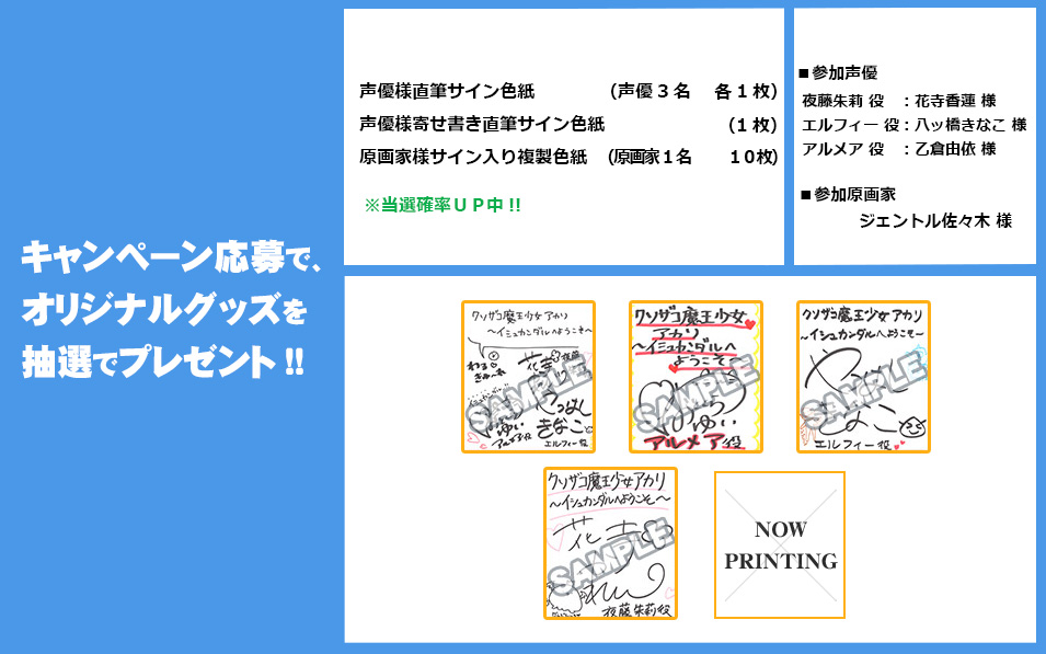 ゲームの発売に合わせて、『クソザコ魔王少女アカリ』のグッズも予約の受付が始まったぞ。グッズは「夜藤朱莉 抱き枕カバー」、「エルフィー 抱き枕カバー」、「アルメア ボイスドラマ付きB2タペストリー」の三点で、全て予約は4月21日まで、発送は5月下旬を予定している。もちろんどのグッズのエロエロな描き下ろしなので忘れずにチェックを!! ちなみにクソザコ魔王少女アカリ グッズ3点セットを購入すると5%OFFとお得だぞ。そして4月28日まで応募ができるX応援キャンペーンも見逃せない。キャンペーンに応募すると声優さんの直筆色紙や原画家サイン入り複製色紙などが計14名に当たるのだ。詳細は公式のキャンペーンページへGO!!