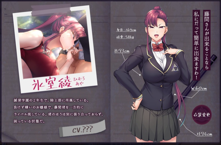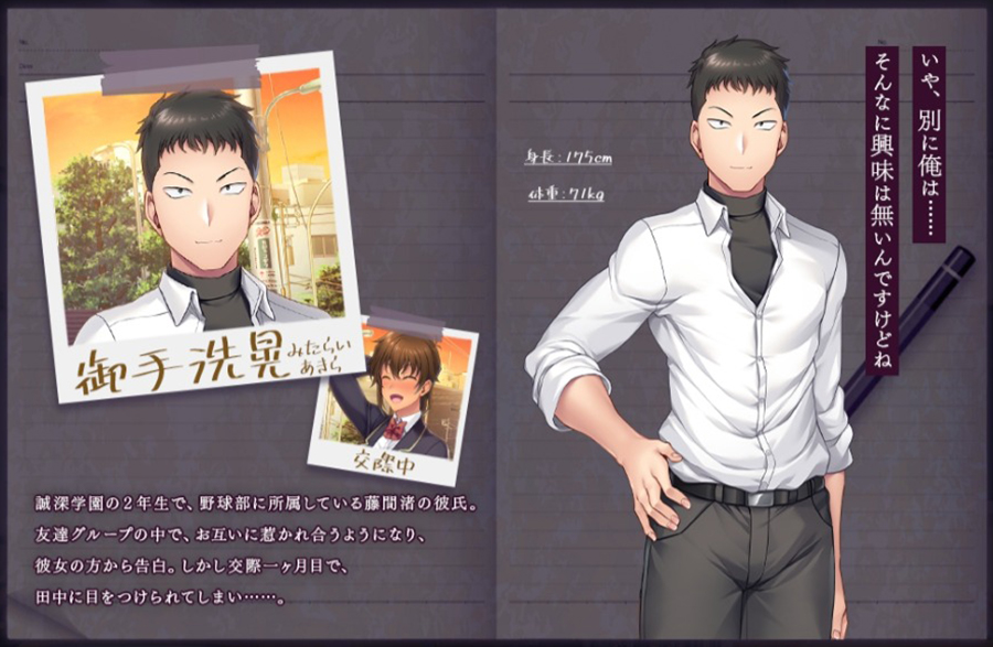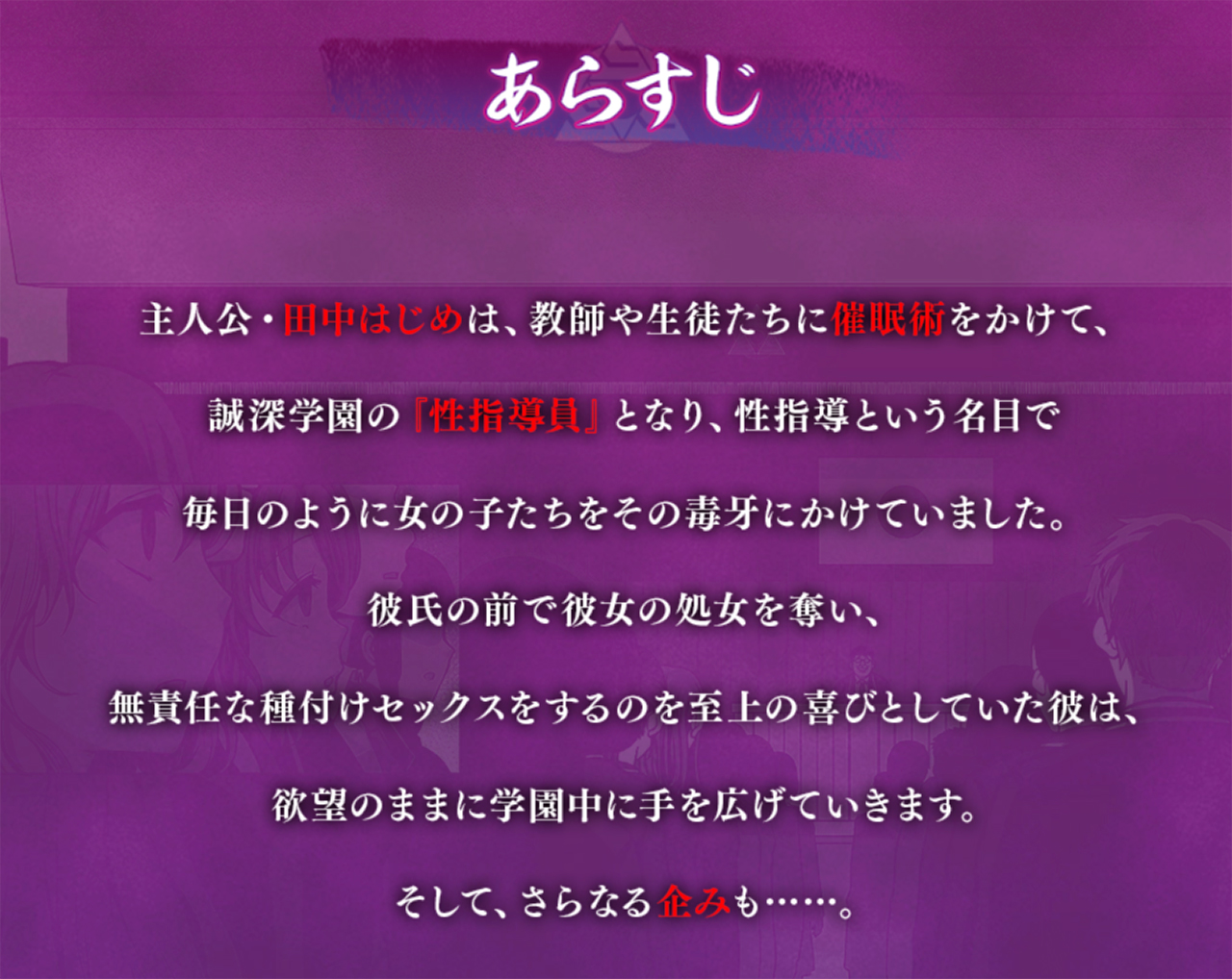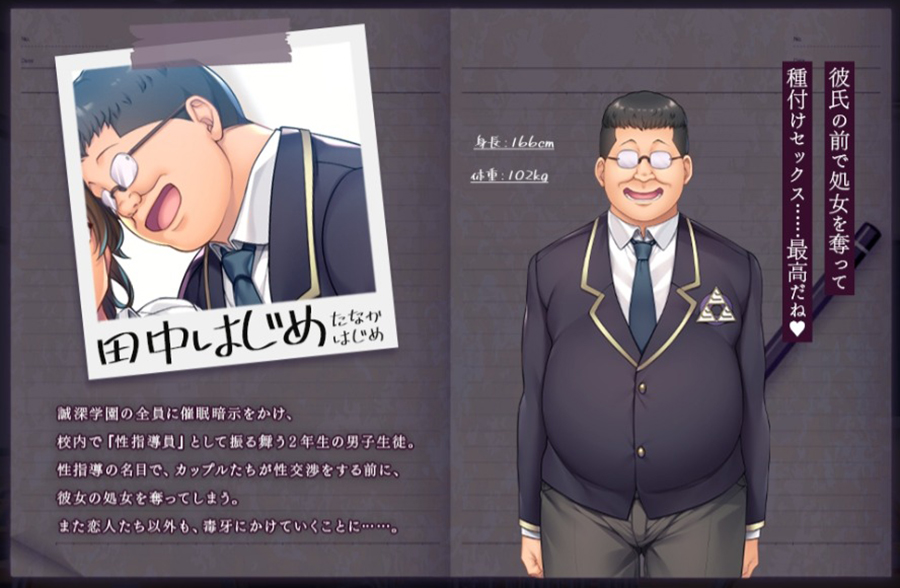 ▲本作の主人公。誠深学園の全員に催眠暗示をかけて「性指導員」になると、指導の名目でカップルたちが性交渉をする前に、彼女の処女を奪ってしまう