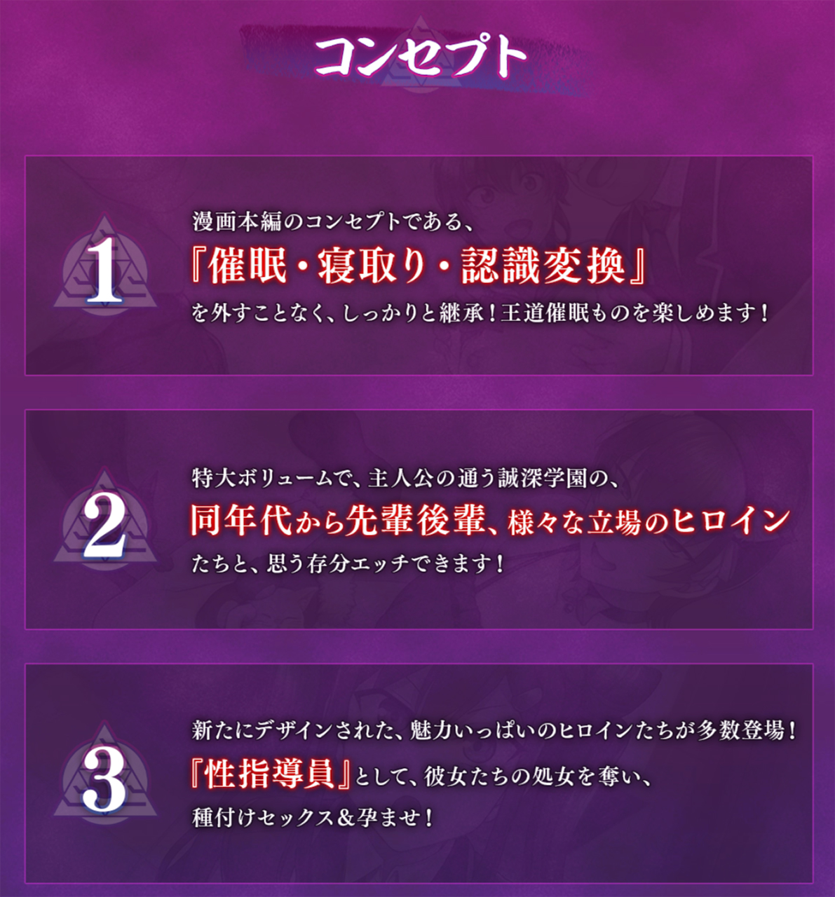 本作のコンセプトも紹介されている。それによると、漫画本編のコンセプトである「催眠・寝取り・認識変換」を外すことなく作品作りに活かした王道催眠モノとのこと。これをベースに、学園の生徒や教師、さらには生徒の母親も含めた14人のヒロインと思う存分Hができるのだ。しかも、ヒロインの多くは処女。男を知らない彼女たちを相手に、欲望の赴くまま種付けセックス&孕ませを実行するのだ!!