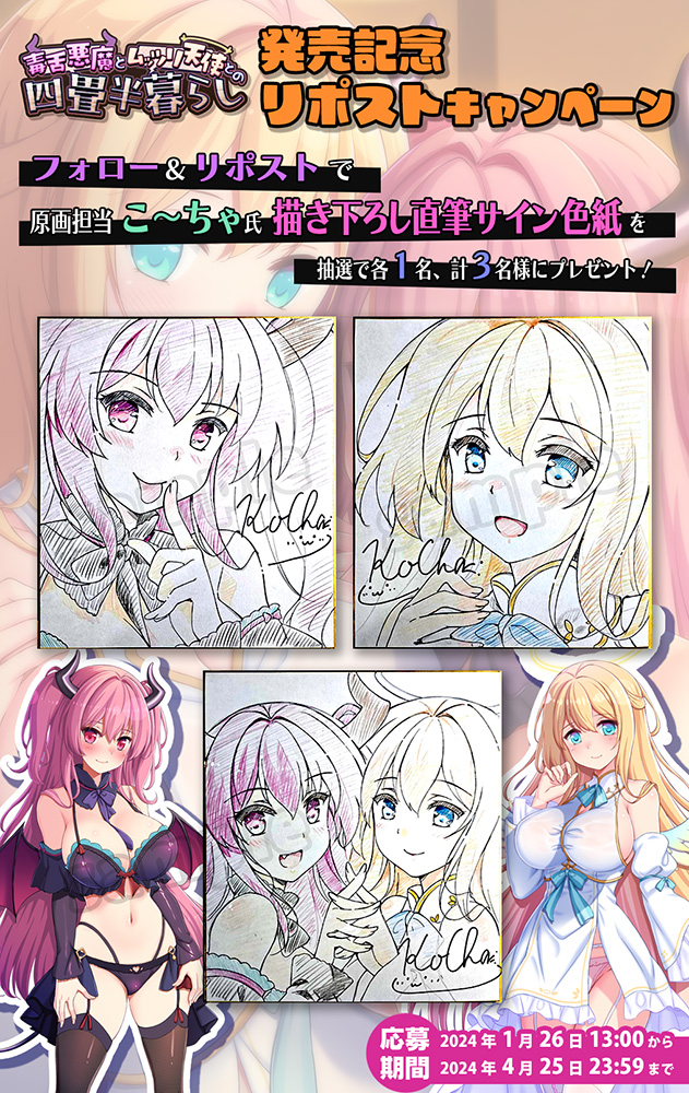 仕事に追われお疲れ気味な童貞主人公が悪魔と天使に毎日搾り取られる日々を描く本作。こ~ちゃ氏が描くエロエロシーンはこの後たっぷりお見せしちゃうので、ここでは各キャンペーンをチェック。まずは発売記念のリポストキャンペーン。こちらはWaffleの公式Xをフォローし、該当するキャンペーンポストをリポストするだけで応募が完了。抽選でこ~ちゃ氏手描きのサイン入り色紙が当たるのだ。応募期間は発売前日の4月25日(木)まで。そしてもう一つがWebアンケート。こちらはゲーム発売後にプレイしたアンケートに答えることで特典をもらえちゃうと言うもの。もらえる特典は『キャラクター画像&デジタル原画集』となっており、作中の様々な画像がPDFデータで見ることができるものだ。どっちも忘れずに応募しよう。