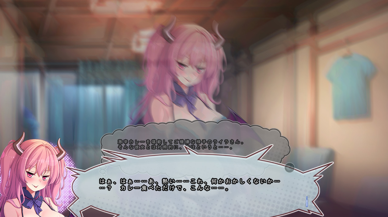 ▲毎日のライラの食事で健康的になりつつある主人公。この日の夕飯は激辛カレー。辛いけど美味しくてどんどん食べちゃう…でも何か入っていたようで!?