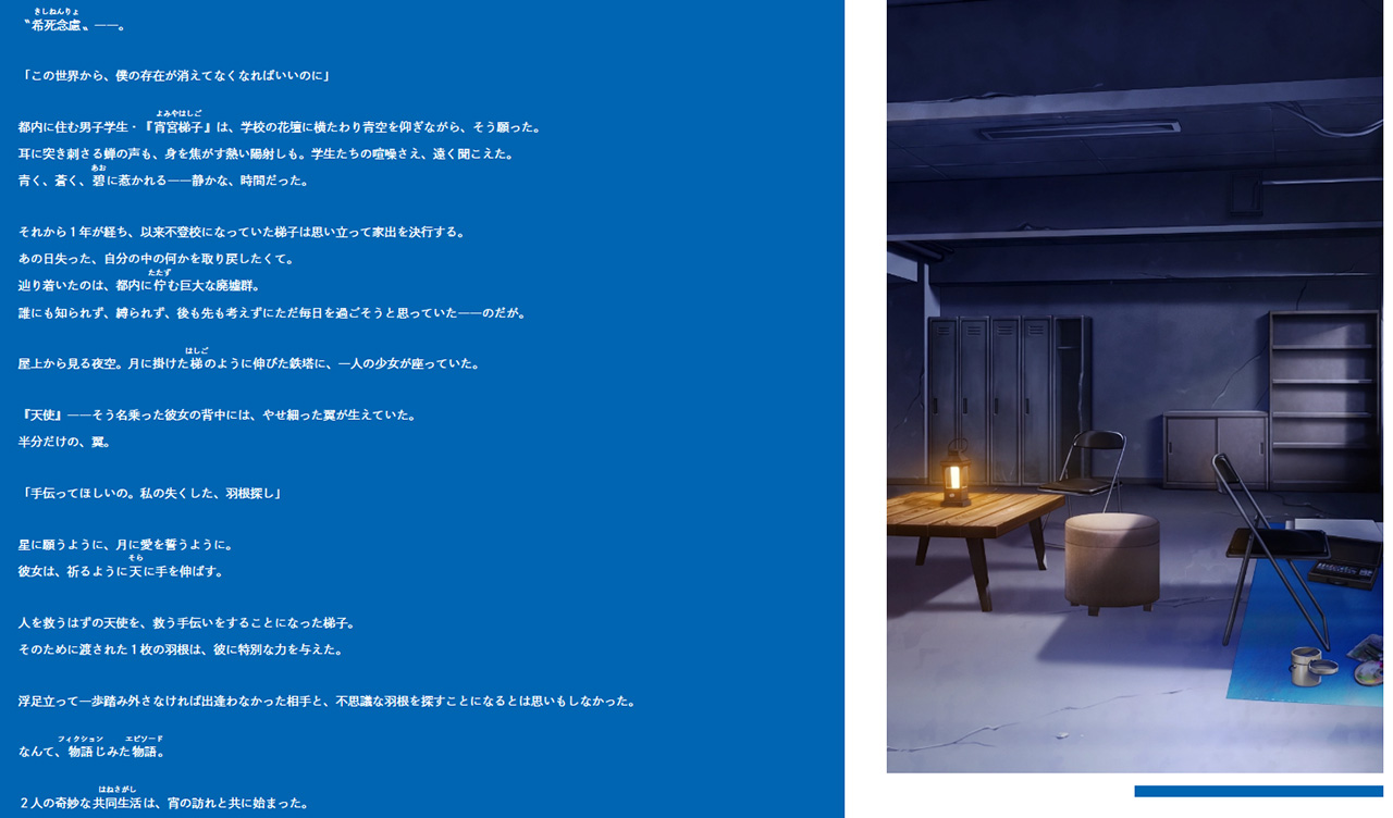 ▲主人公はとある出来事から不登校になった学生。そんな彼が片翼の天使と出会ったことで物語は幕を開けるのだ