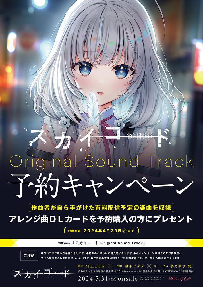 現在予約受付中の本作だが、ゲームの他に同日発売のサントラの予約も受け付けている。しかもゲーム、サントラ共に予約キャンペーンを行っているのだ。ゲームの方は予約をすることでB5イラストカードが、サントラはアレンジ曲のDLカードがもらえちゃうぞ。どちらも同日の4月29日(月・祝)までの受付となっているので、忘れずに予約をするべし!!