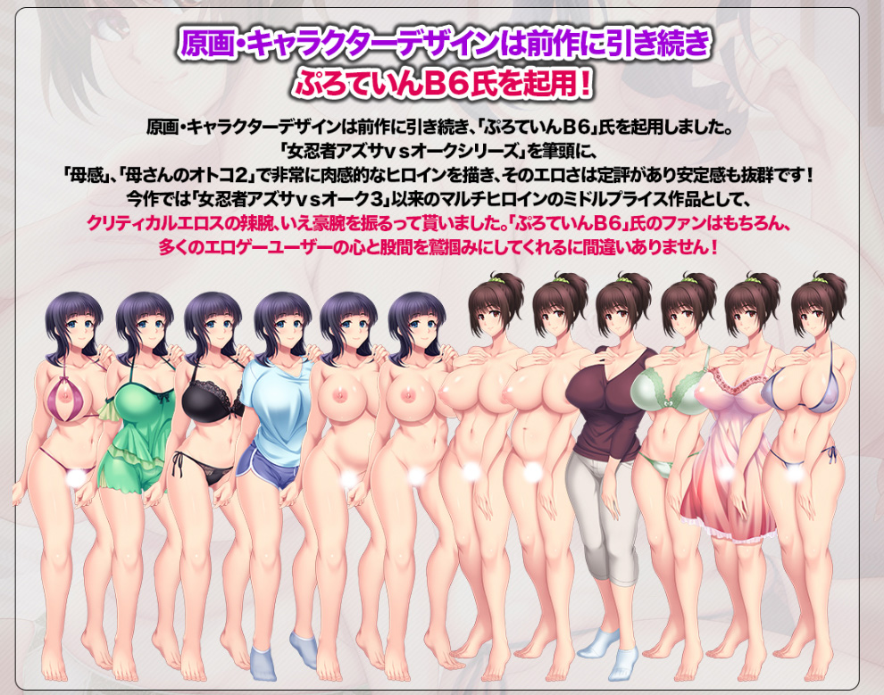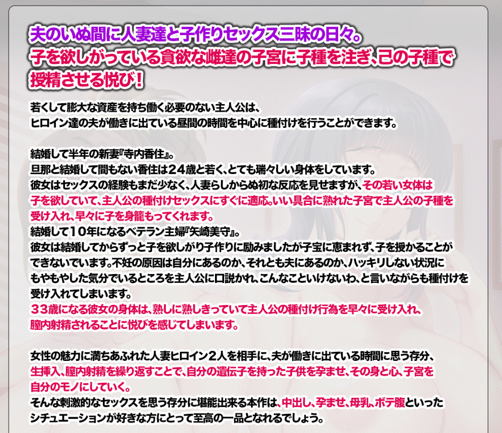 人妻を自分の子種で孕ませたい──そんな欲望を叶えてくれるのが『人妻天国』だ!! 子供を欲しがっている貪欲な雌たちを言葉巧みに口説き、熟れた子宮に子種をタップリ注ぎ込む!! 戸惑いと罪悪感を感じながらも何度も身体を重ねてしまうヒロインたちの背徳感溢れる姿もタマラないね♥ そして、原画を担当するのは前作に続きぷろていんB6氏。氏の描く肉感的なヒロインたちに、多くのエロゲユーザーが心と股間を鷲掴みにされること間違いナシ!!