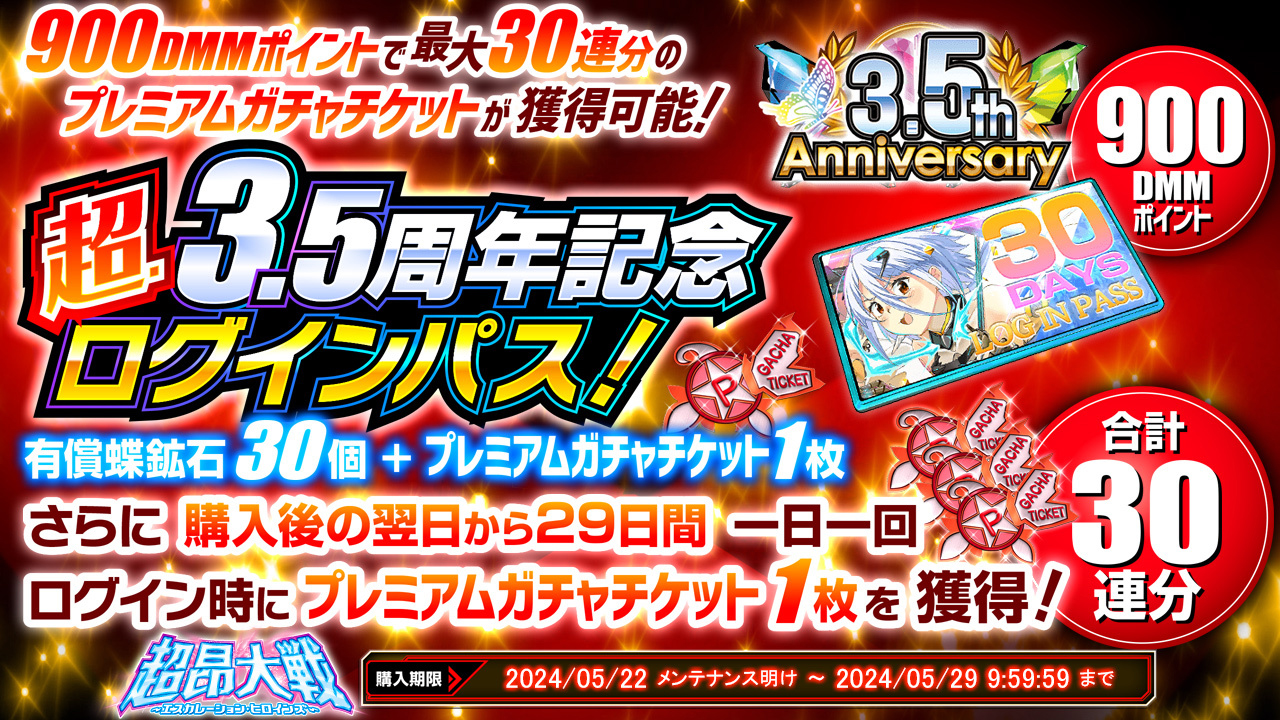 超・3.5周年記念ログインパス【最大30枚プレミアムガチャチケット】