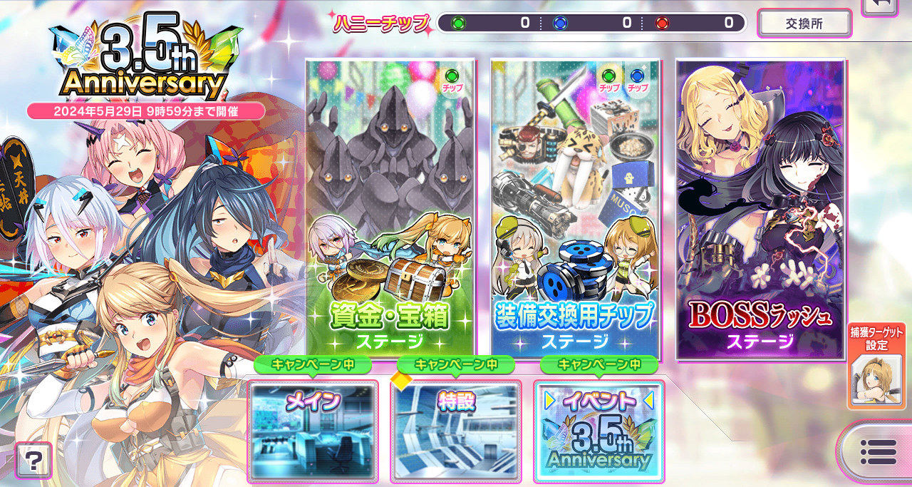 「3.5 Anniversary イベントページへ」から進める記念イベントは、ハニーチップ(緑・青・赤)を集めて豪華報酬と交換していく。
