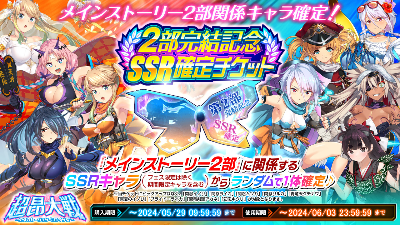イノリ、ライカ、りるか、ムツカのほか、2部終盤で活躍したキャラクターたちあわせて9人のSSRキャラから1人が確実に当たる「2部完結記念SSR確定チケット」が期間限定で発売。
