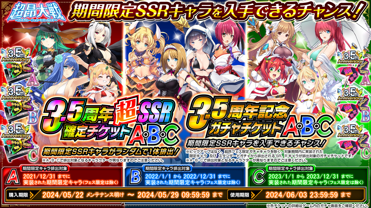 今回は4つのステップで構成される「超3.5周年記念A・B・C」、3つのステップで構成される「3.5周年記念A・B・C」、あわせて6パターンも登場。
