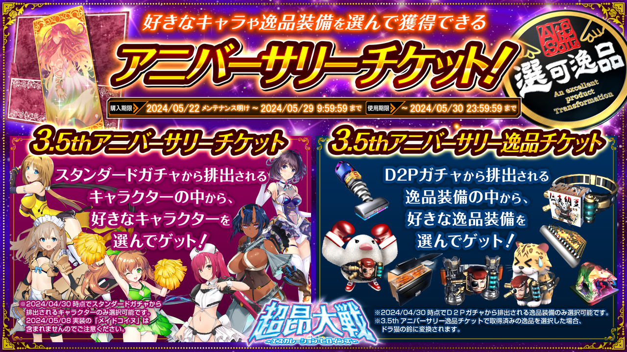 好きなキャラクター、逸品アイテムと交換出来る「アニバーサリーチケット」。