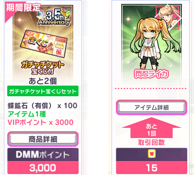 そのほか、蝶鉱石100個+ガチャチケット宝くじをセットにした「ガチャチケット宝くじセット」も期間限定販売。