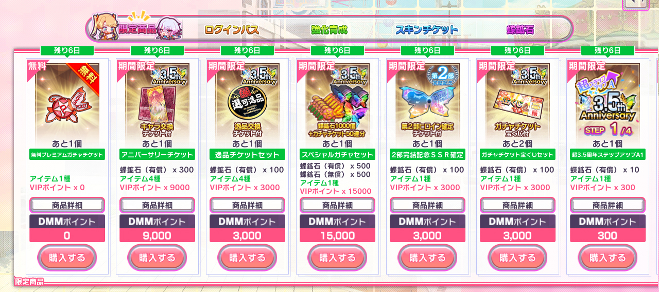 『3.5周年記念スペシャルガチャセット』は蝶鉱石が有償+無償で1000個、プレミアムガチャチケット50連分がセットに!!