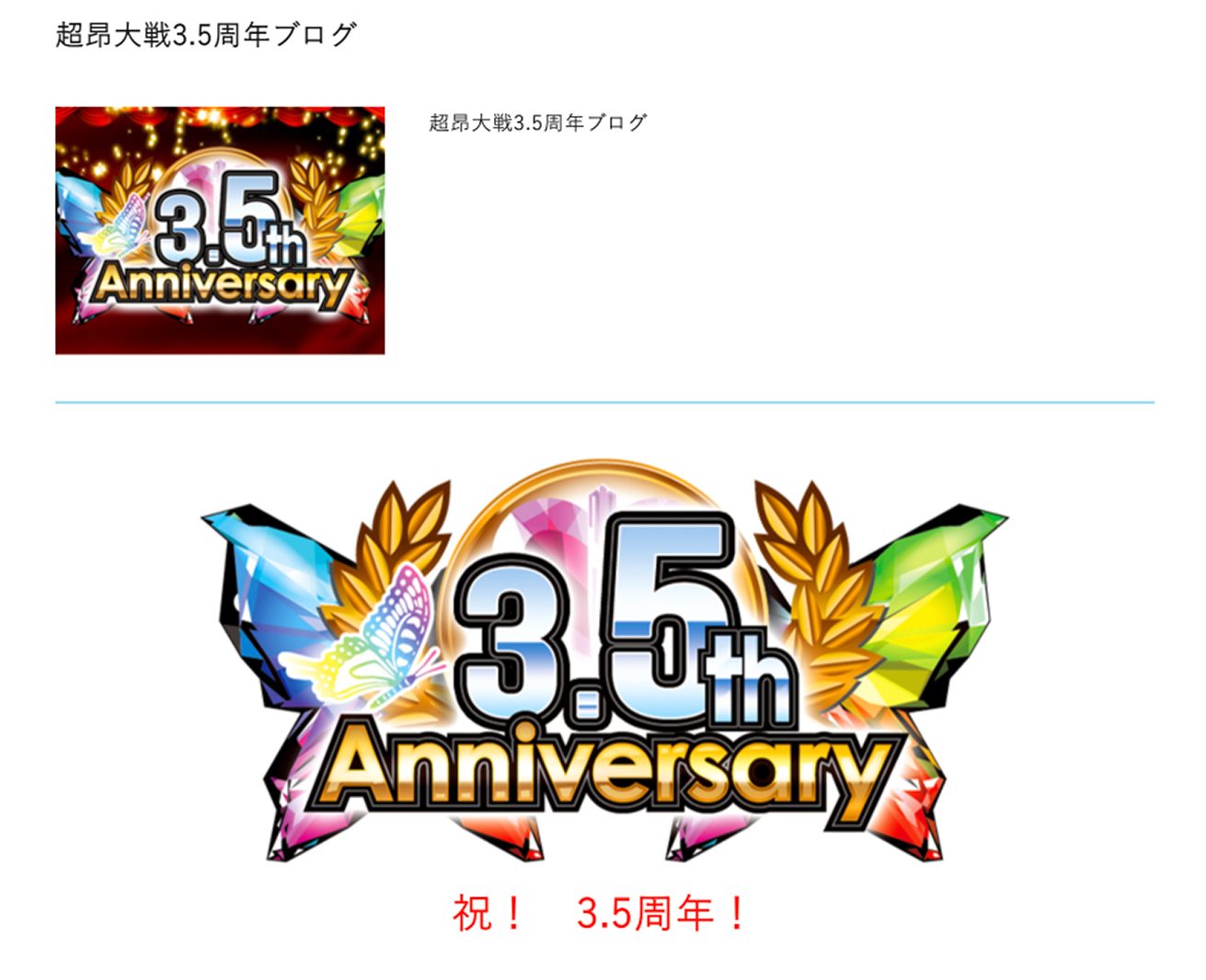 ▲『超昂大戦3.5周年ブログ』の最後にはプレミアムガチャチケットがもらえるコードもあるぞ
