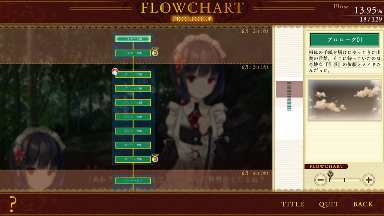 ▲こちらはフローチャート。好きなシーンから再開できるし、大事なシーンにマーカーをつけたりも可能な、便利な機能だ。(開発中につき変更になる可能性があります)