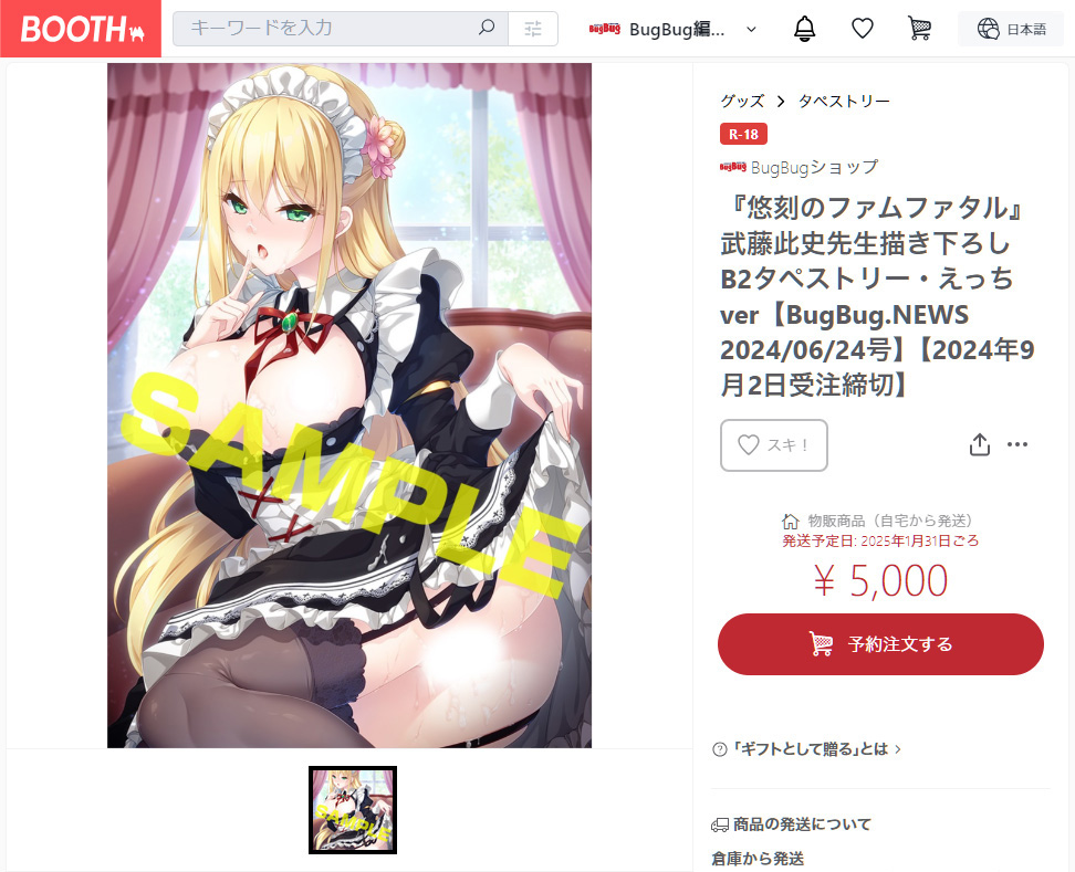 ▲BOOTHの【BugBugショップ】では、BugBug.NEWSのトップを飾る描き下ろしの「表紙ver」と、さらにHになった差分イラストを用いた「えっちver」の2種類のB2タペストリーを期間限定で予約受付中。予約締切は9月2日までなので、なるだけ早めに応募しておこう!!