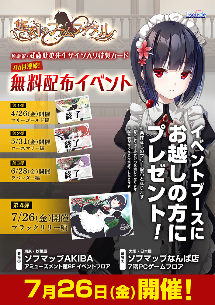 ▲4ヶ月連続で開催の無料配布イベント。会場はソフマップAKIBA 8Fのイベントフロアと、ソフマップなんば店 7F PCゲームフロア。4回目となる7月26日の開催ではブラックリリーの特製カードが貰えるぞ