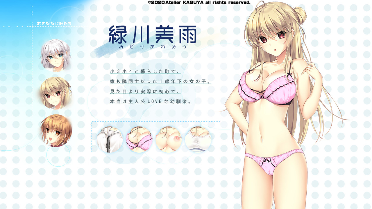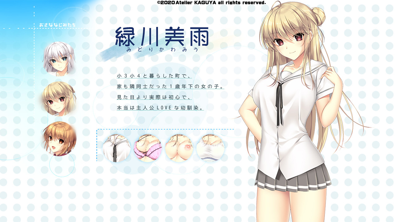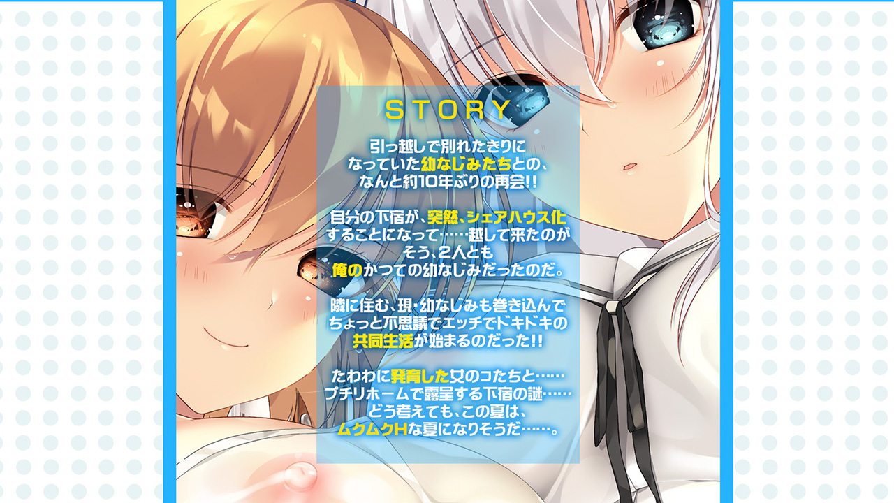 本作のヒロインは三人の美少女。どの子も子供の頃に一緒に過ごした幼なじみたちとなっており、そんな子たちと再会したらとっても可愛くてエロく育っていて…。しかも彼女たちと共同生活まで始まるとあって、もうこれで手を出さないわけがない!? 原画を担当するyoppy氏の描く少女たちは、みんな超発育が良い!! どの子もおっぱいが大きいので巨乳好きにはたまらないのだ。個性的すぎる彼女たちと過ごす毎日はドキドキでムクムクで、今からプレイするのが楽しみだぞ♪