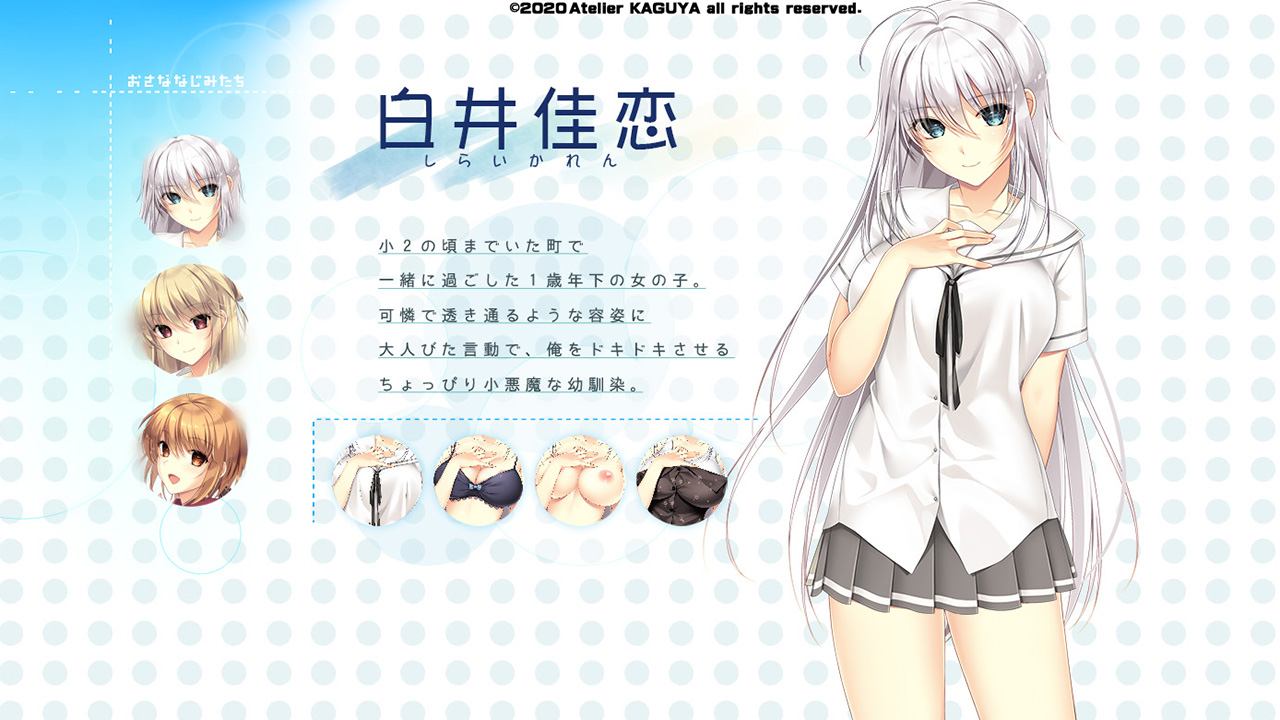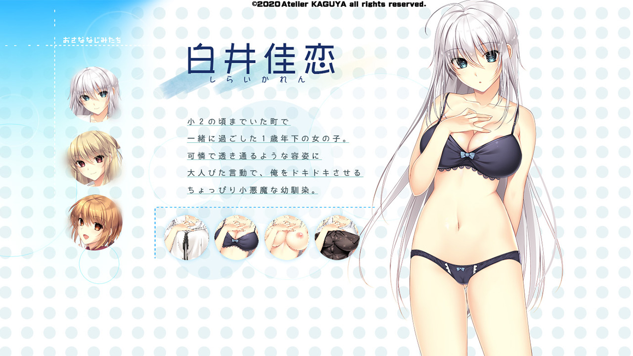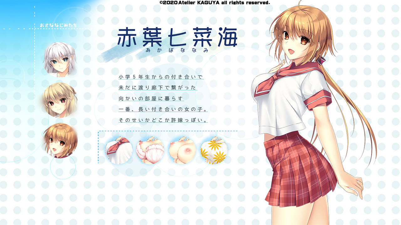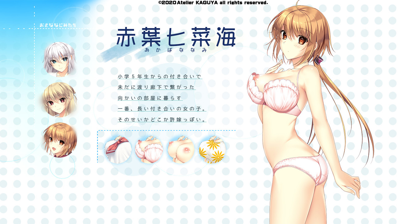 本作のヒロインは三人の美少女。どの子も子供の頃に一緒に過ごした幼なじみたちとなっており、そんな子たちと再会したらとっても可愛くてエロく育っていて…。しかも彼女たちと共同生活まで始まるとあって、もうこれで手を出さないわけがない!? 原画を担当するyoppy氏の描く少女たちは、みんな超発育が良い!! どの子もおっぱいが大きいので巨乳好きにはたまらないのだ。個性的すぎる彼女たちと過ごす毎日はドキドキでムクムクで、今からプレイするのが楽しみだぞ♪