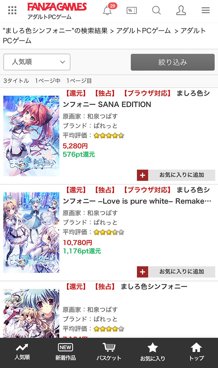 『ましろ色シンフォニー』の大人気サブヒロイン・乾紗凪がメインになった『ましろ色シンフォニー SANA EDITION』をスマホで楽しんじゃおう。 2009年発売のぱれっとの名作恋愛AVG『ましろ色シン ... 『ましろ色シンフォニー -Love is pure white- 』で大人気のサブヒロイン・乾紗凪がメインの作品『ましろ色シンフォニー SANA EDITION』のリメイク作に注目!! 2009年発売 ... ぱれっとの名作『ましろ色シンフォニー -Love is pure white- 』がフルHD化&Hシーンのアニメ化&UIのブラッシュアップをして再びファンの前に降臨!! 2009年に発売したぱれっとの ... シリーズ累計25万本突破!! 学園異能バトルの傑作がFANZA GAMESではブラウザ対応。パソコン無しでも遊べるぞ!! 「9-nine-」シリーズとは、神社に祀られていた神器の破損を切っ掛けに、普通 ...