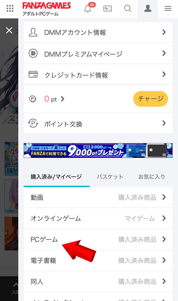 ▲購入手続きが完了したら、DMMアカウント情報内の赤い矢印が指す「アダルトPCゲーム」をタップ。リストに本作が登録されていれば購入が完了で、すぐ遊べるように