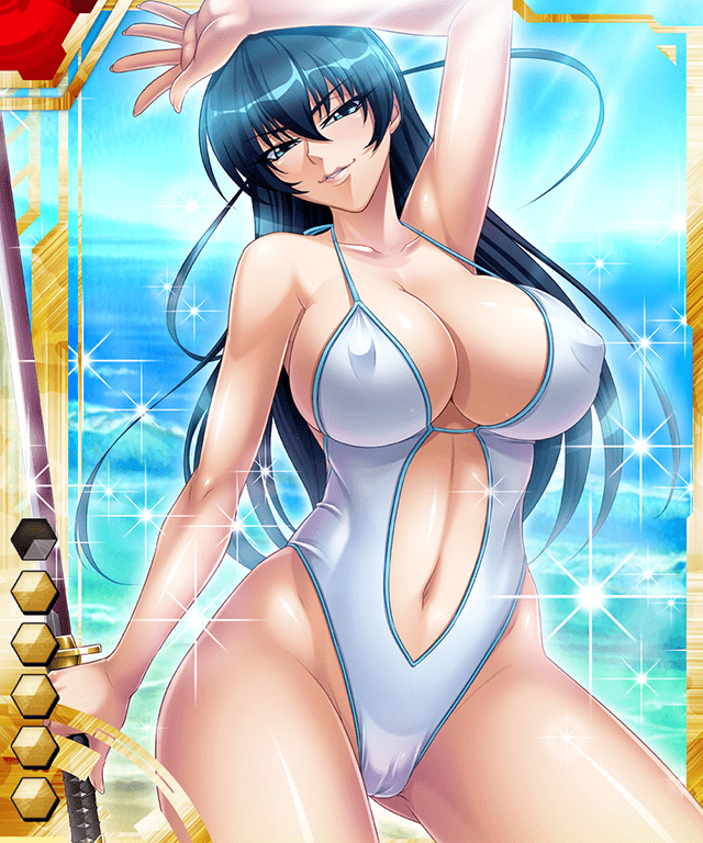 ▲【渚の最強対魔忍】アサギ★。←カード名。さくらが選んだ水着らしい。原作には登場しない、オリジナルのデザイン。どんな衣装でも堂々としている