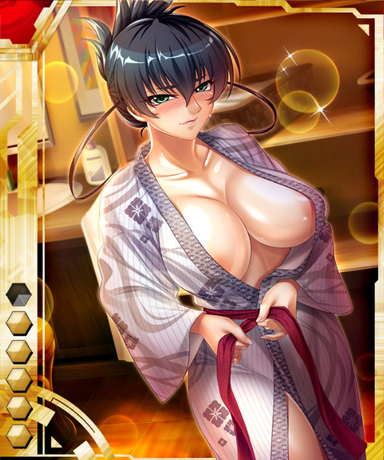 ▲【戦士の湯治】井河アサギ★。対魔忍スーツの凛々しいカードとは違い、コスプレ系のイラストは甘いものが多い。恋人にダダ甘くなるのは、この人の昔からの癖だ