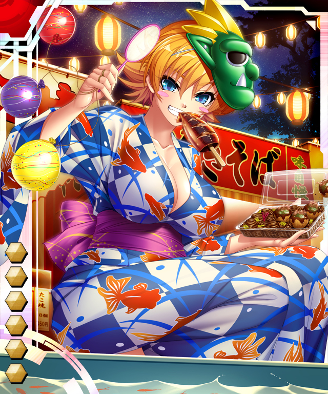 ▲【夜店のクイーン】井河さくら。『RPGX』にはあまりない、浴衣イラスト。お祭りを楽しむ姿が活き活き描かれていて、さすが後期LRカード(最高レアリティ)の風格である。お面はオークかと思わせて、どう見てもブランカ
