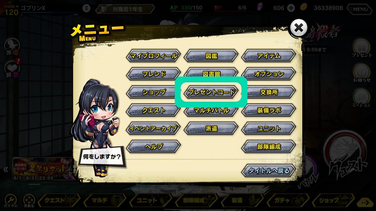▲プレゼントコード入力は、メニューの"プレゼントコード"から!!