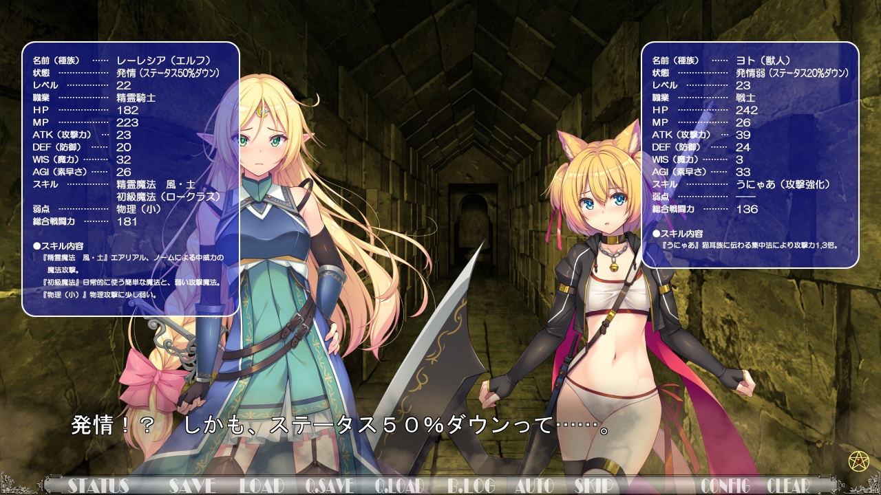 途中からはスキルツリーも見ることができるようになり、さらに有用度の増すタケモト。もちろんスキルの習得条件はエッチ。光属性攻撃=パイズリ、スタン耐性=アナルセックス、攻撃スキル強化=緊縛セックス十回絶頂、呪い耐性=女性上位騎乗位セックス…といった感じで、エッチ消極派のレーレシアも必要に駆られて「仕方なく」エッチに興じることになるのですが、本番になるとエロくなるのがポイント!!