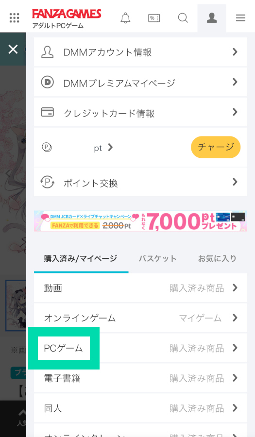 ▲購入完了したら、検索に使った虫眼鏡アイコンの右にある、人の頭みたいなアイコンから、「購入済み/マイページ」の「PCゲーム」をタップ
