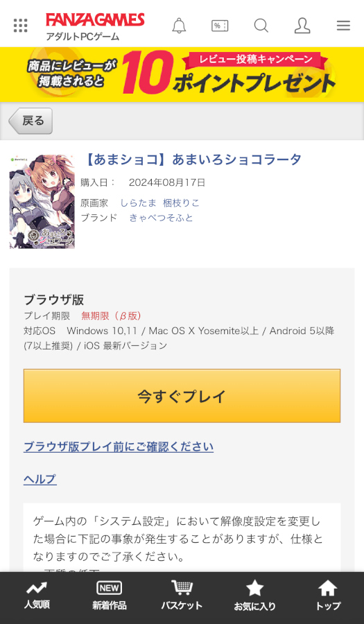▲作品ページに飛んで「今すぐ購入する」ボタンをタップ。プレイ環境の確認は忘れずに