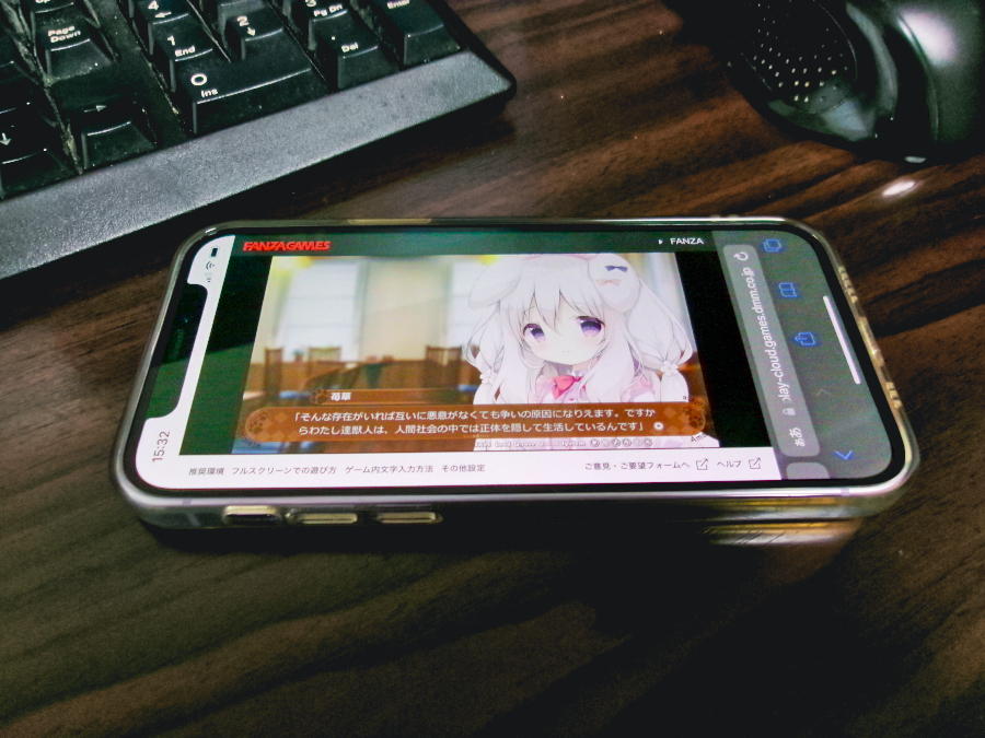 ▲PCデスクに座っている時もスマホで起動してキーボードの横においておけば、暇々に触ってストーリーを進められる。かわいいケモ耳ウェイトレスさんが側にいれば、仕事も捗るってものだ