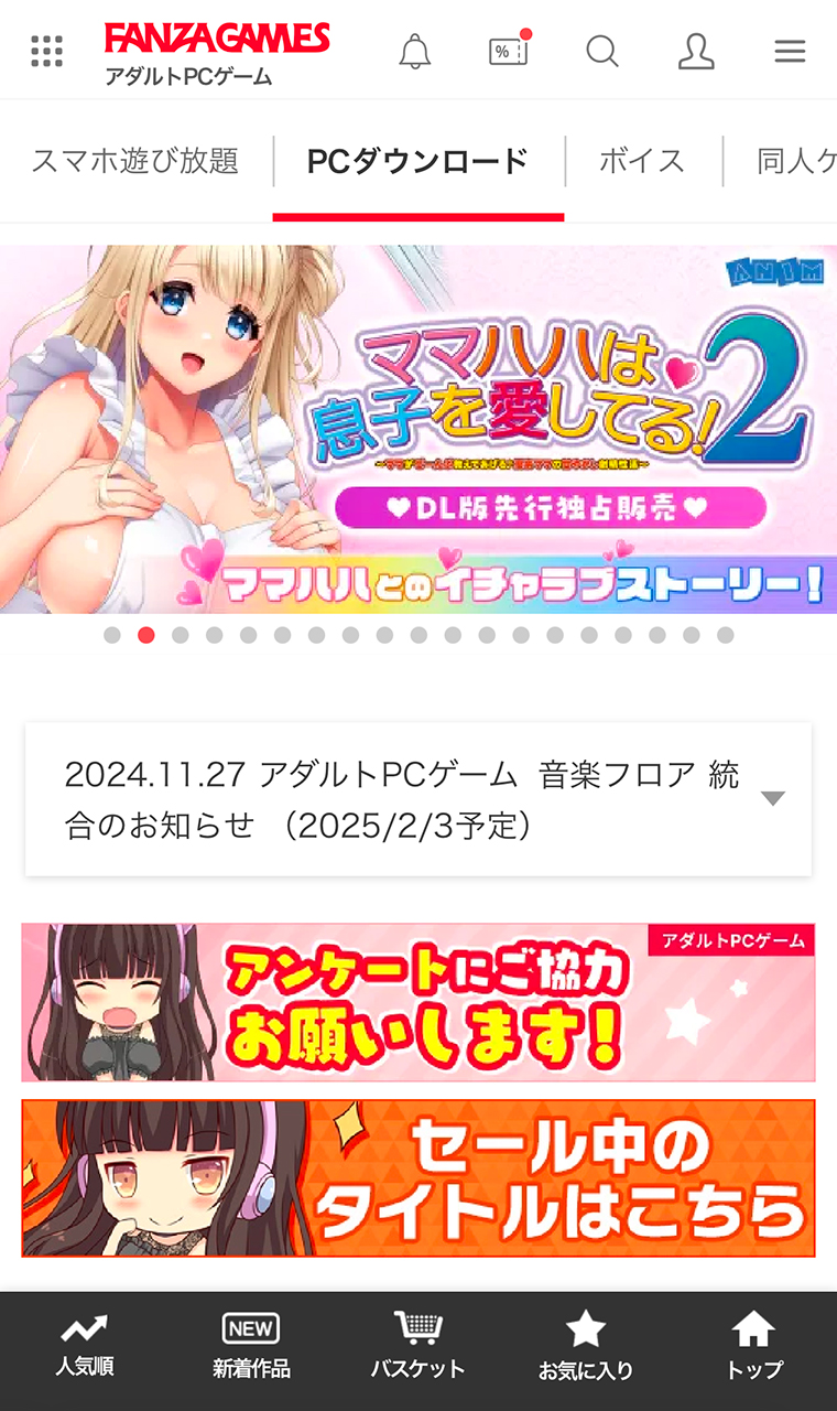 ▲まずはブラウザでFANZAの「PCゲーム」トップ画面を開く。右上の虫眼鏡アイコンから作品を検索。別に総合トップ画面で検索しても問題ない