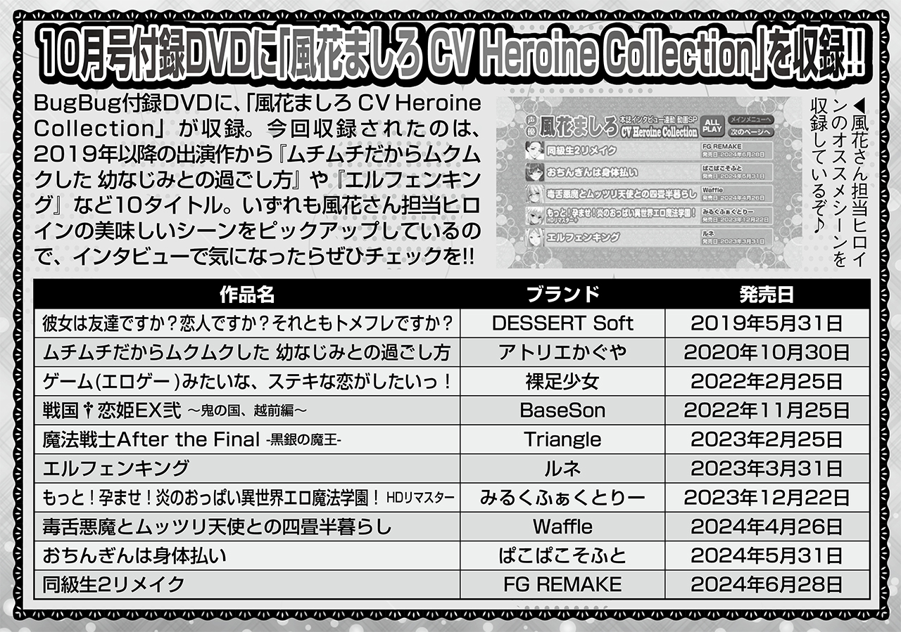 BugBug10月号は、今年でデビュー10周年を迎える風花ましろさんを紹介。全7ページにわたって濃密に語られた彼女の声優のお仕事への、そして美少女ゲームへの熱意と楽しさ。その一部をここで特別にお見せしちゃおう。