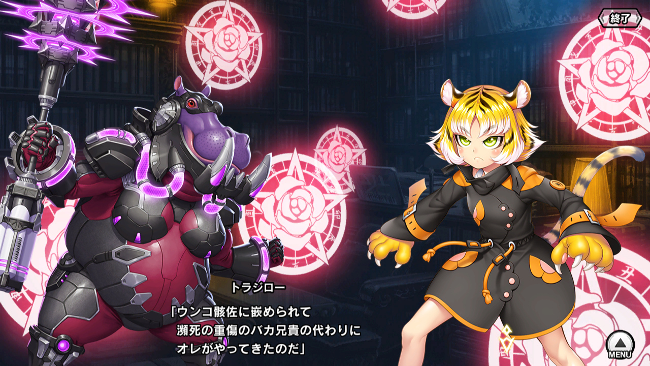 ▲助っ人その1、トラジローとヒポポたま。獣王会は骸佐に敗北したが、一郎太が逃がしてくれたお陰で幹部は無事。トラジローなんか、兄貴が重傷を負って怒りに燃えまくっている