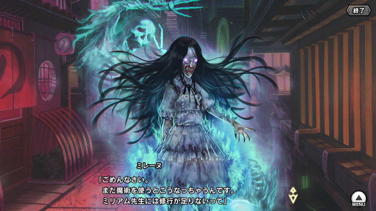 ▲懐かしの、異界のものに憑りつかれたミレーヌのビジュアル(メインクエスト・チャプター30"幽霊屋敷の魔術師"参照)。魔術を使うとこうなってしまい、しばらく戻らないらしい。早く魔術を上手にしてあげてミリアム先生!