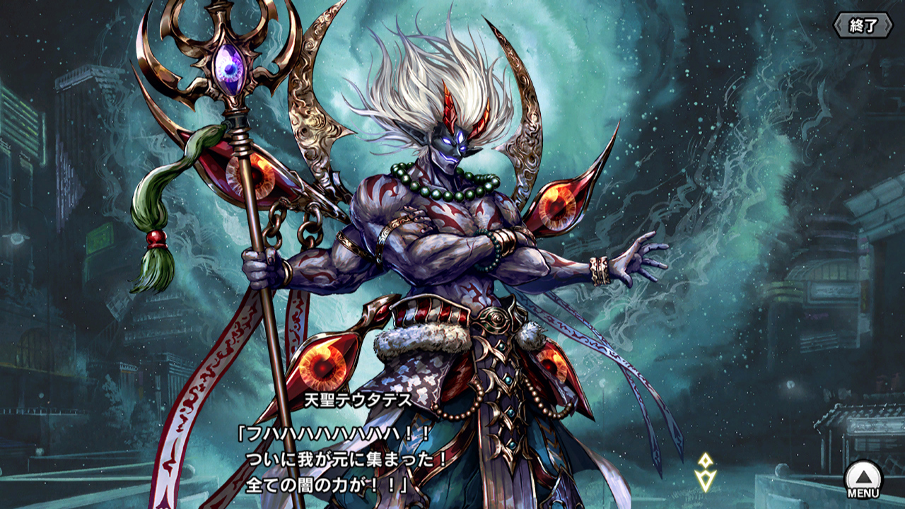 ▲メインクエスト・チャプター72"動乱の終奏曲"のレイドボスは天聖テウタテス。Lv.35としか戦っていないので、性能はよくわからない。ドロップする装備の欠片は清流。禍津夜叉髑髏と同じく、登場時に格好いい演出が入る