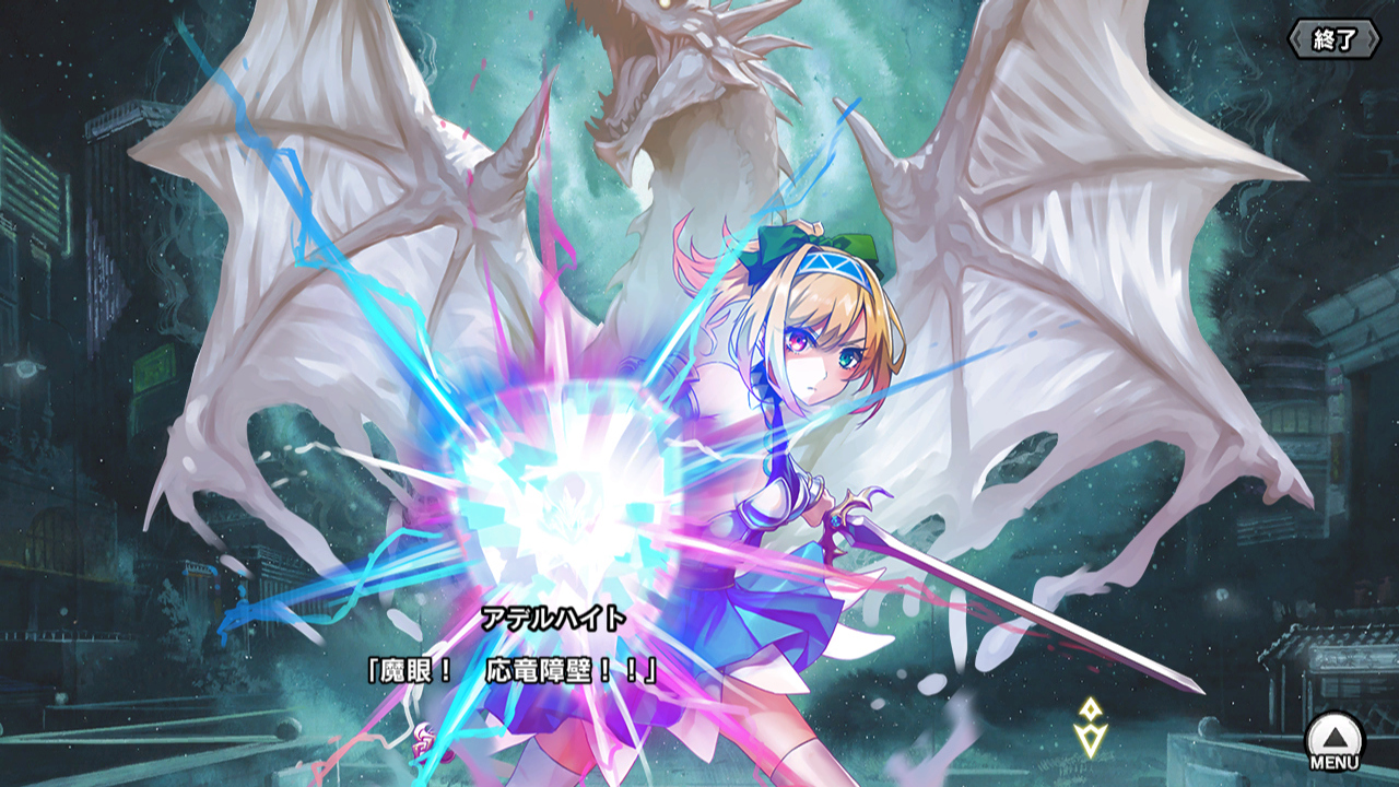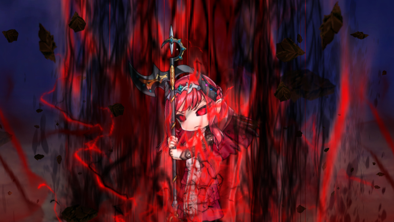▲奥義、ベルセルク・マターダムの演出。ベルセルクを発動して赤い目になったアレクトラが、赤黒のオーラを立ち昇らせる。への字口に怒り眉の顔がかなり好きだが、放置していると愛しそうにお腹を撫でるギャップもいい