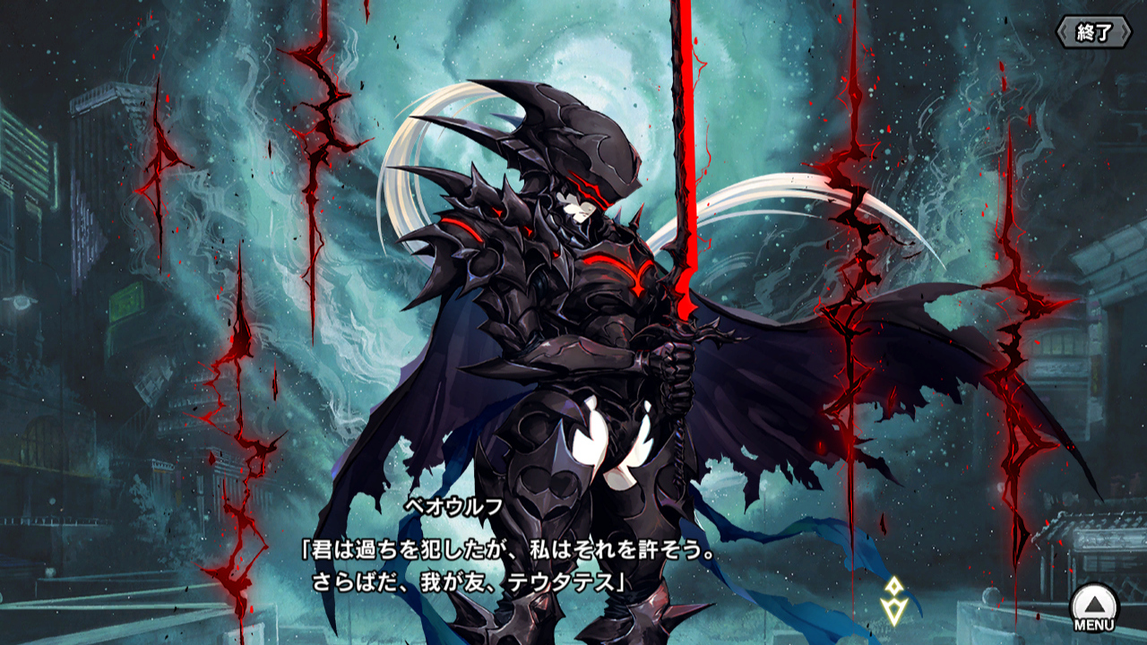 ▲ベオウルフが過去に手に入れた竜の力、死者の魂と対話する力で、天聖テウタテスから元となった騎士テウタテスの魂を引き剥がす。彼女が友である騎士テウタテスを消滅させたことで、天聖テウタテスは世界再創生、つまり不死の力を失った。理由は不明だが、再創生は条件が厳しくて完全性を僅かでも欠くと実行できないのだろう