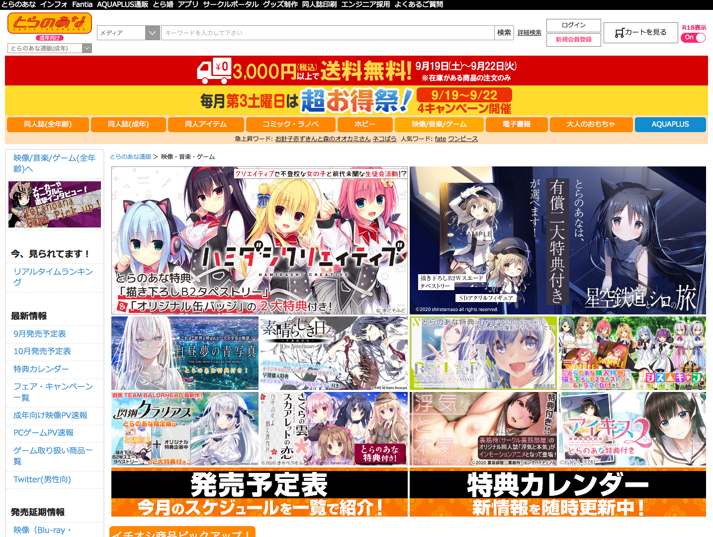 各ショップとも9/25発売の『ハミダシクリエイティブ』(まどそふと)がほぼ1位を占拠するランキング結果に。体験版も大ボリュームで好評なので、プレイしてお気に入りのヒロインの特典があるお店で購入しよう。オーガストの『夜明け前より瑠璃色な コンプリートパック 15周年記念パッケージ』にも注目。新たに描き下ろされた人気ヒロインの特典はもちろん、当時に付いていた店舗特典のイラストを使用した復刻の特典もあったりして、超豪華で注目だぞ。