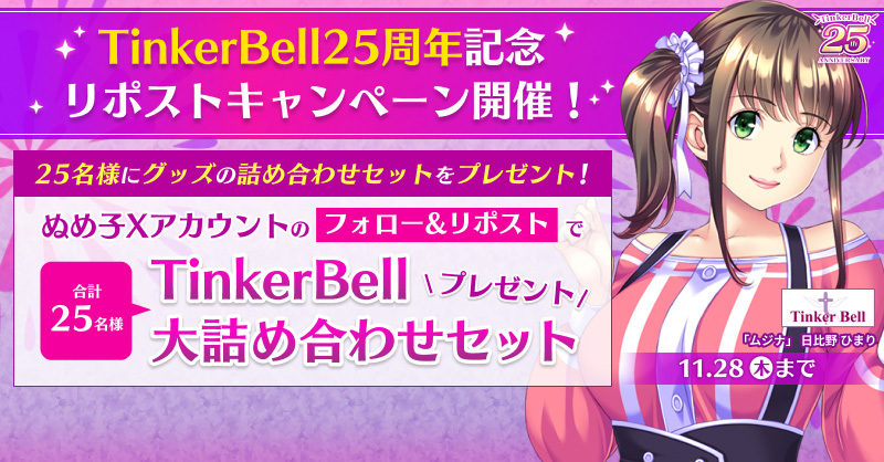 X(旧Twitter)のFANZA GAMESエ口ゲDL公式アカウント・ぬめ子公式X(@fanzagames_jhg)にて、対象ポストをリポストすると、抽選でTinkerBellの人気グッズを詰め合わせたセットが25名様に当たるキャンペーンが開催中だ。