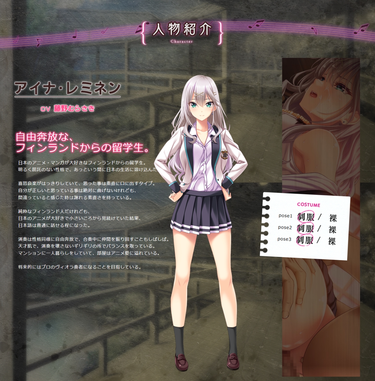 2019年にリリースされた『虜ノ旋律 -refrain- 調律される処女たちと女教師』のスピンオフで、本編にも登場したフィンランドからの留学生である銀髪美少女のヴィオラ奏者、アイナ・レミネンにスポットを当てた、ifストーリーになっている。