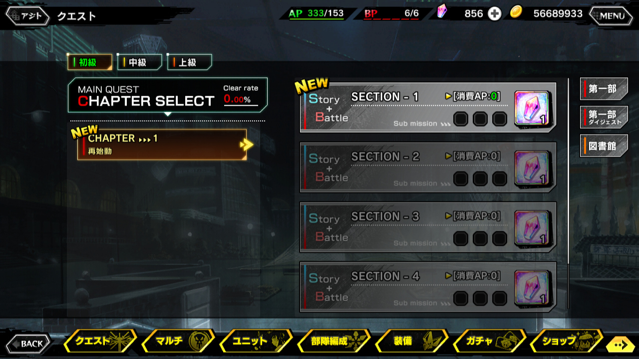 ▲第二部はクエスト選択画面もリニューアル。右の第一部ダイジェストを押すと、ざっくりしたこれまでのあらすじを教えてくれる。読み上げは、多分アサギさん(蒼乃むすびさん)。ゴブリンは耳がアレなので、多分だけど。終了ボタンで抜けられるが、流してても大体4分くらいで終わる