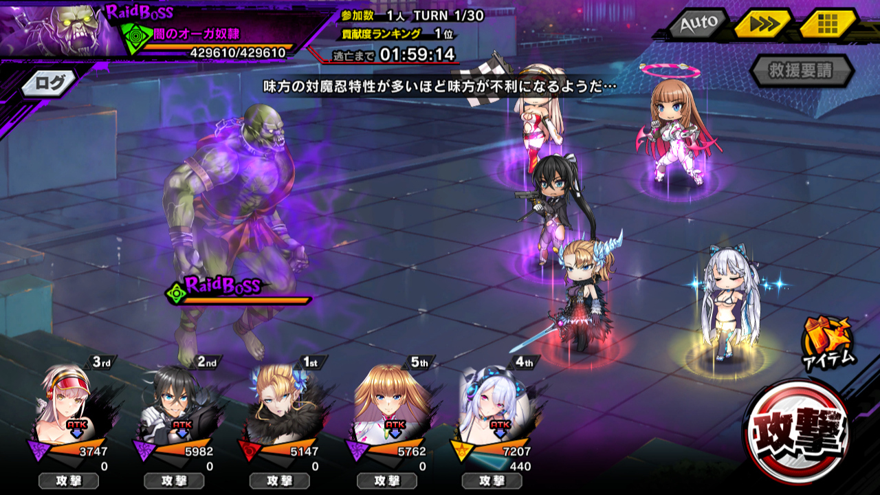 ▲レイドボスが全然出現してくれなかったので、とりあえずLv.35闇のオーガ奴隷の画像。特殊ルールがいろいろ付属しているが、要するに「味方に対魔忍がいると、特性デバフが付与される」という内容だ。対魔忍が多いとデバフの効果量も増える
