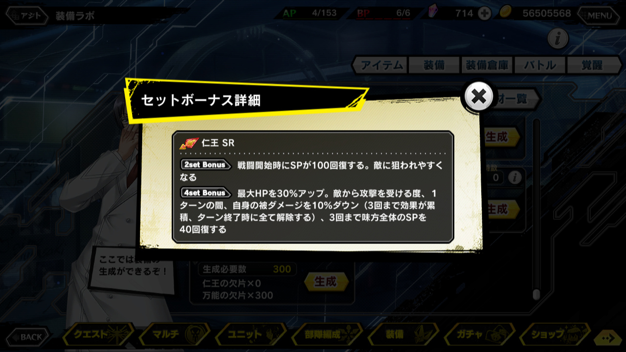 ▲ドロップする装備の欠片は、新装備の仁王。最大HPの上がり幅が大きいし、味方全体のSPを回復できるし、被ダメージもダウンできるしで、何やら使い道がありそうな気がする。レイドボス討伐が面倒なので、とりあえず万能の欠片を使ってセットを作ってみよう